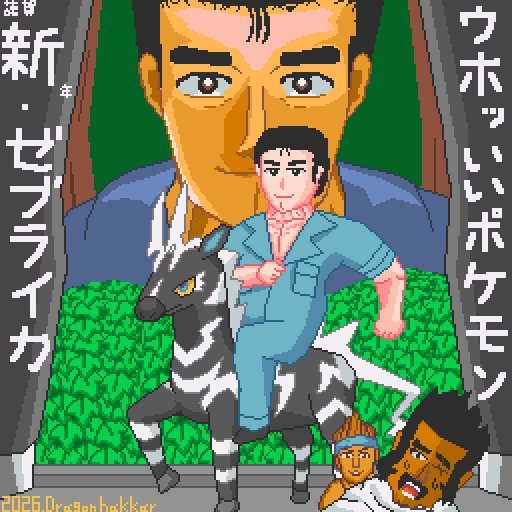 問題の年賀絵。元ネタは新・やらないか構図。というか主役が馬のゼブライカじゃなくて阿部さんってどういう事なのってぐらいカオスでした。